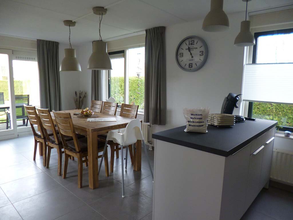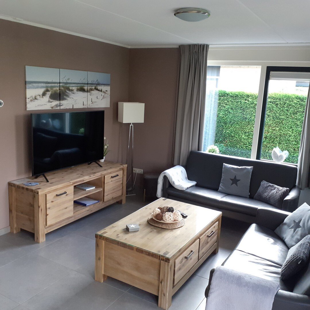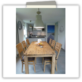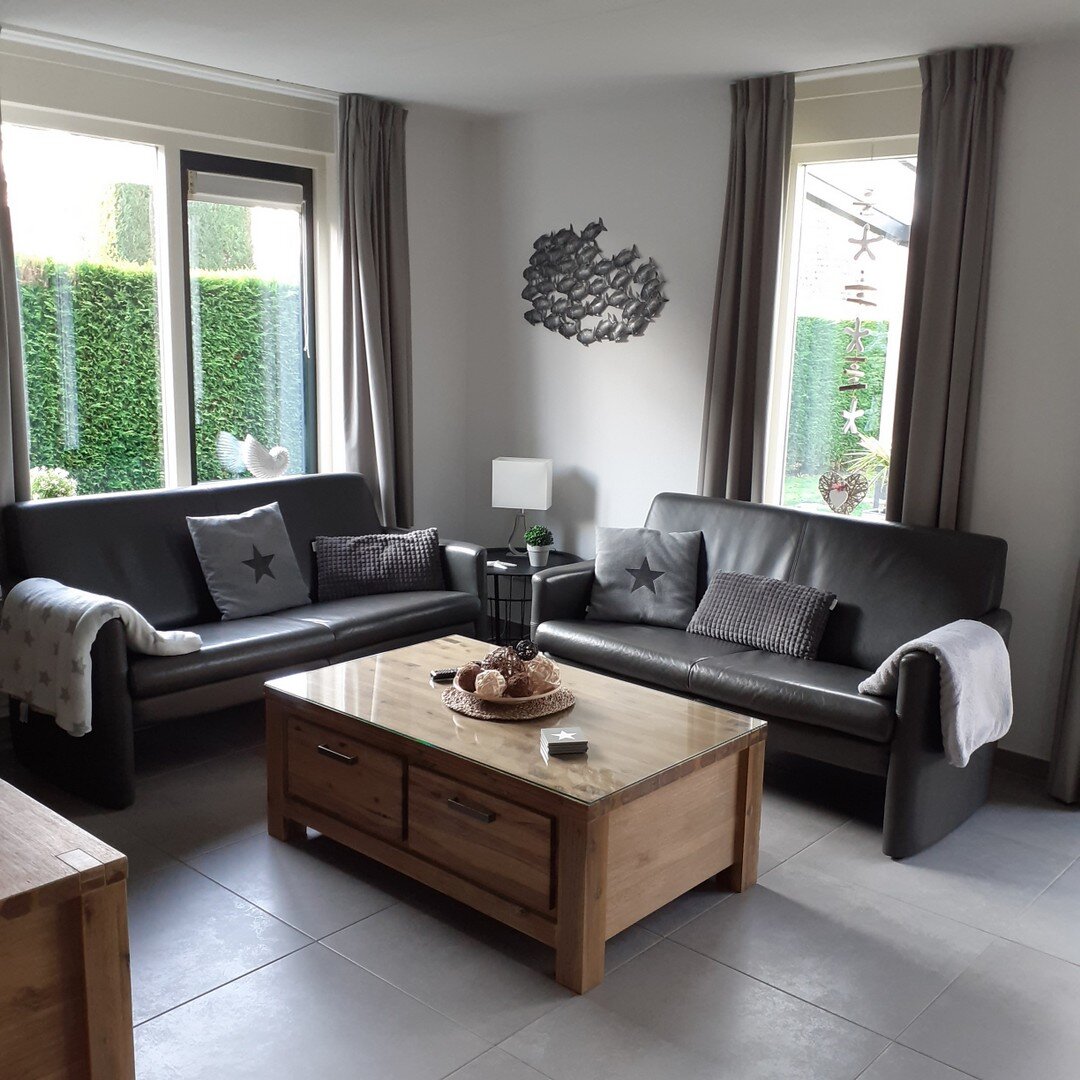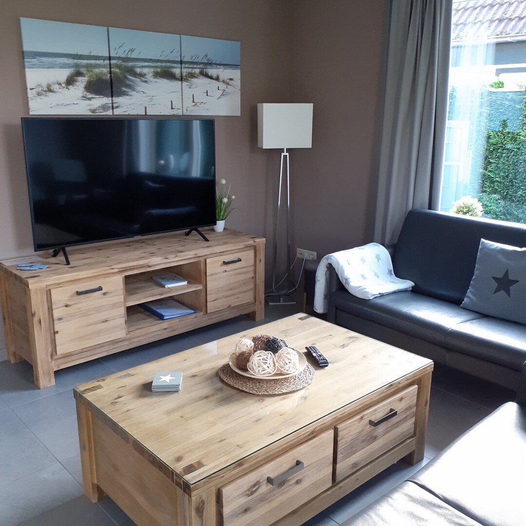 Im Erdgeschoss befindet sich ein Schlafzimmer mit zwei Einzelbetten, Gäste WC und ein großer Wohn/ Essbereich mit Zugang zur Terrasse und eingezäunten Garten. Auf der großzügigen Terrasse spendet eine Terrassenüberdachung mit Markise Schutz bei Regen und Sonne.